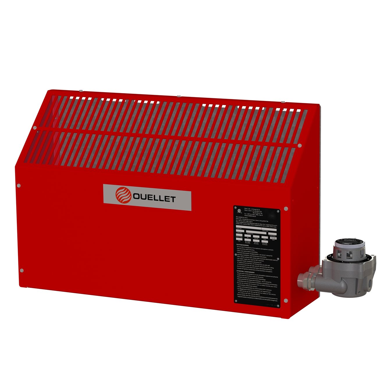 The OPXA explosion-proof air heater is designed to heat areas at risk of explosion. Easy to install vertically using the provided mounting brackets, it features a high-quality Incoloy® 800 heating element. Its explosion-proof wall-mounted or integrated thermostat ensures safe operation. The sloped top prevents objects from being placed on the unit and ensures optimal heat distribution, providing both safety and efficiency
